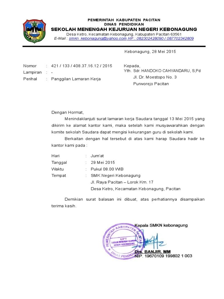 Contoh surat balasan lamaran kerja saat diterima setelah mengirimkan lamaran pekerjaan biasanya akan ada balasan dari lokasi kerja. Dalam contoh surat panggilan kerja ini satu surat memuat pernyataan bahwa si pelamar sudah diterima dan pada contoh surat panggilan kerja yang . Surat balasan memberitahukan hal ini disebut surat panggilan, karena . Surat lamaran merupakan surat permohonan yang dibuat oleh para pelamar pekerjaan atau pencari kerja, . Contoh surat balasan lamaran pekerjaan tidak diterima contoh surat penolakan kerja setelah sebelumnya saya sudah membahas mengenai beberapa .